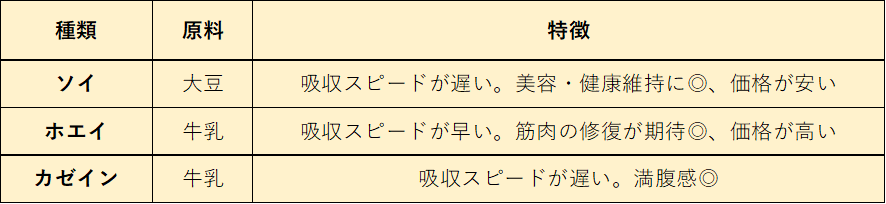 プロテインは、①ソイプロテイン②ホエイプロテイン③カゼインプロテインの3種類に分類されます。