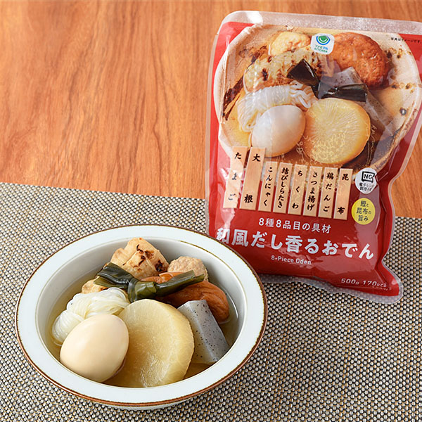 和風だし香るおでんです。8品目入って170キロカロリー。特に、たまごは、ビタミンCと食物繊維以外のほとんどの栄養素をバランスよく含む食べ物です。良質なタンパク質も豊富なのでダイエットに向いています。またコリンは、脂質の代謝をサポートする働きがあります。そして卵黄には、コレステロールを下げる作用が期待されているレシチンや抗酸化作用があるビタミンA・Eも含まれています。